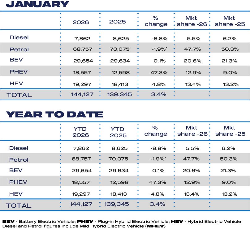 According to the latest figures from the Society of Motor manufacturers and traders (SMMT), the UK new car market grew 3.4% in January with a total of 144,127 new cars registered. The strongest growth was once again seen in plug-in hybrids, which accounted for 12.9% of all registrations.